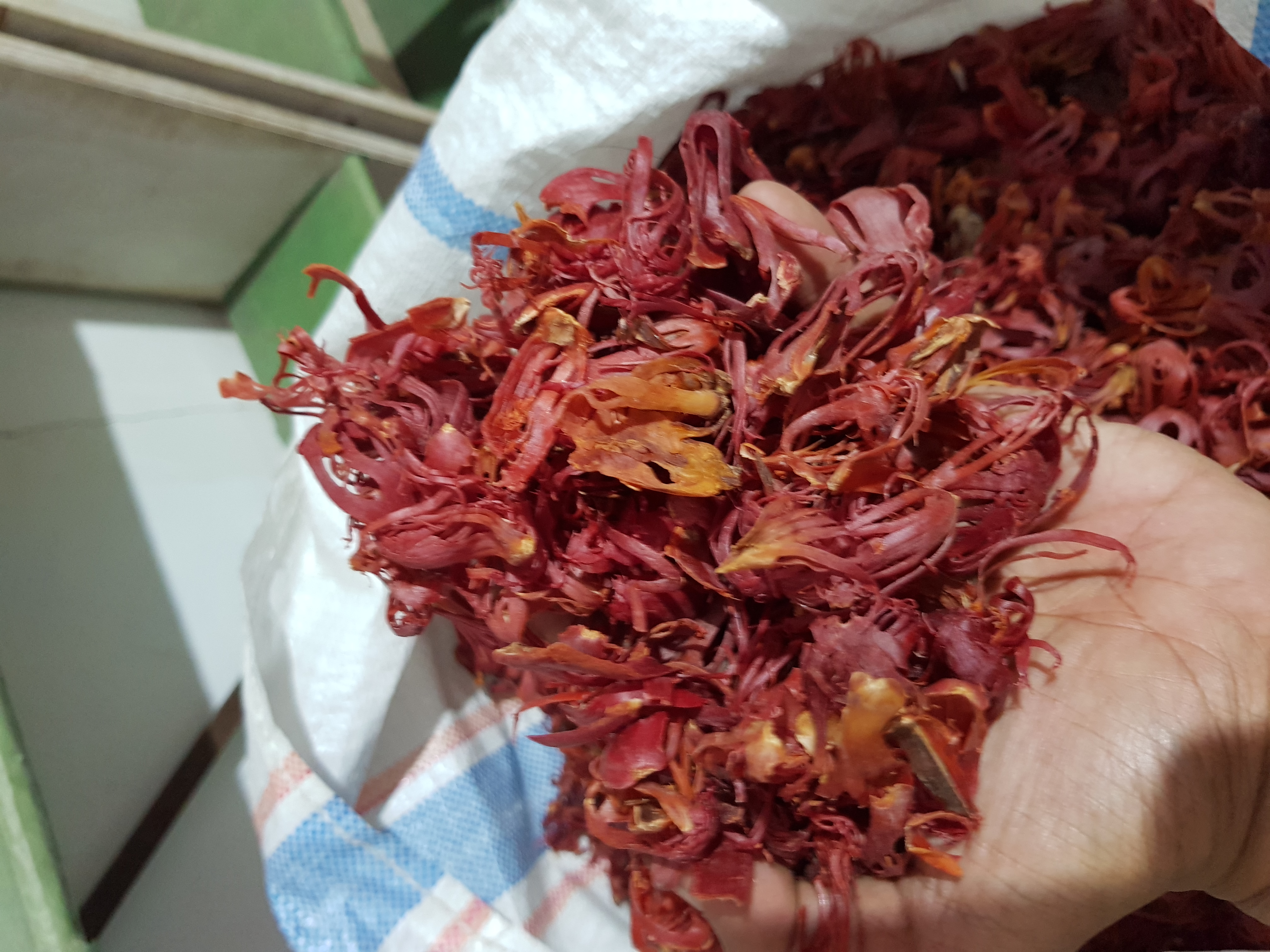 In the processing of mace, the crimson-colored aril is removed from the nutmeg seed that it envelops and is flattened out and dried for 10 to 14 days. Its color changes to pale yellow, orange, or tan. Whole dry mace consists of flat pieces—smooth, horny, and brittle—about 40 mm (1.6 in) long.